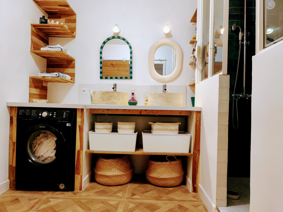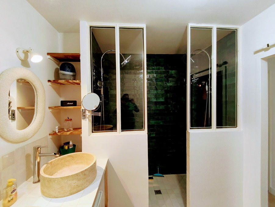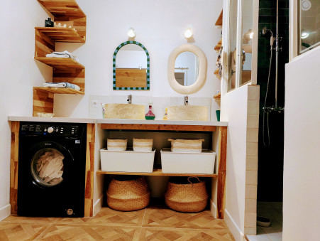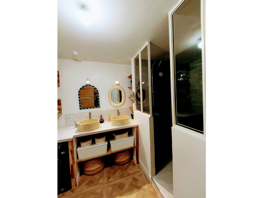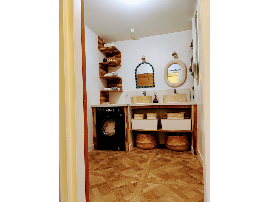 depuis la pièce de vie, un dégagement vous permet d'accéder à cette superbe salle d'eau avec sa grande douche et sa double vasque, vous trouverez encore du rangement dans le cellier avant de découvrir les 2 jolies chambres dont une profite de la climatisation.
